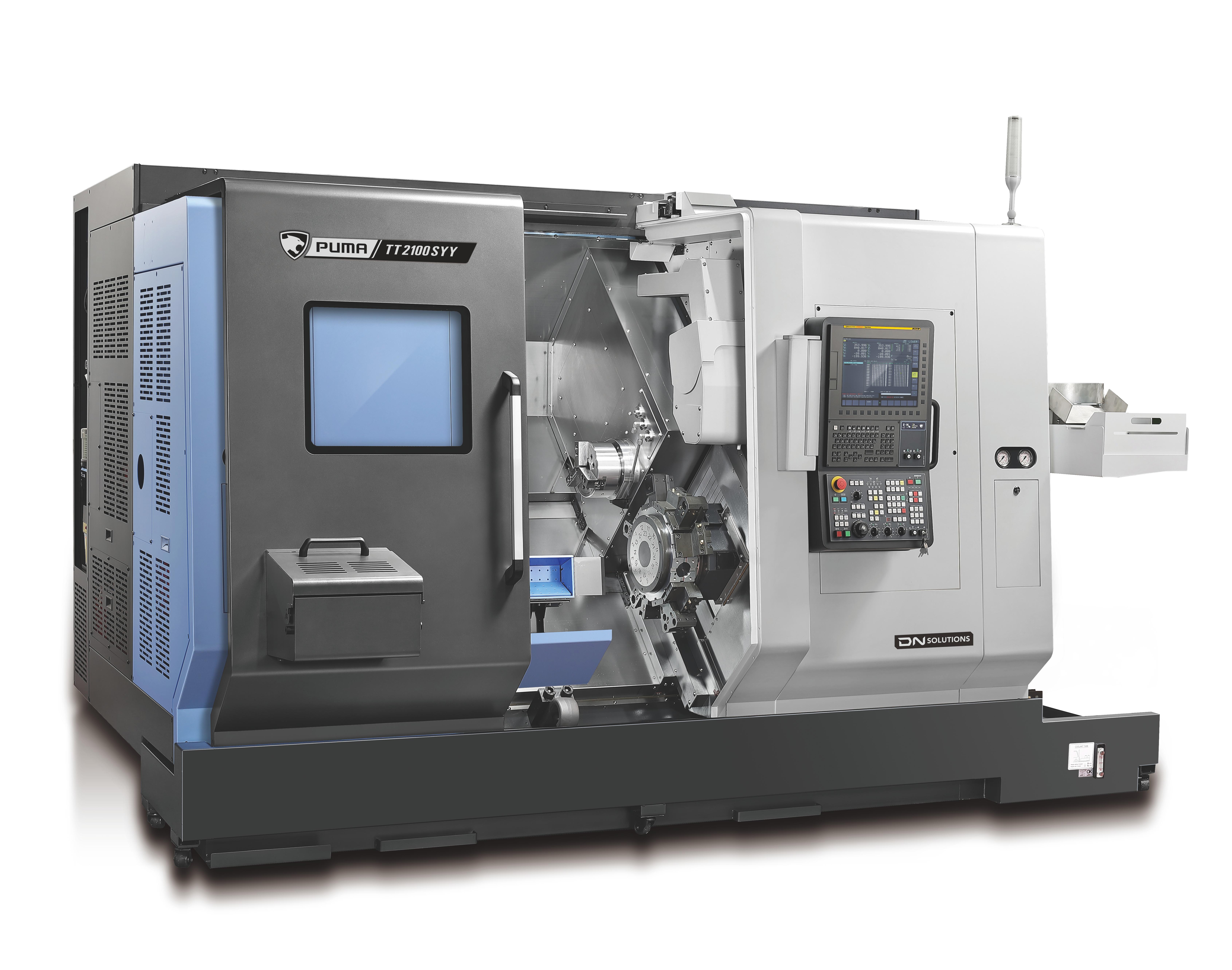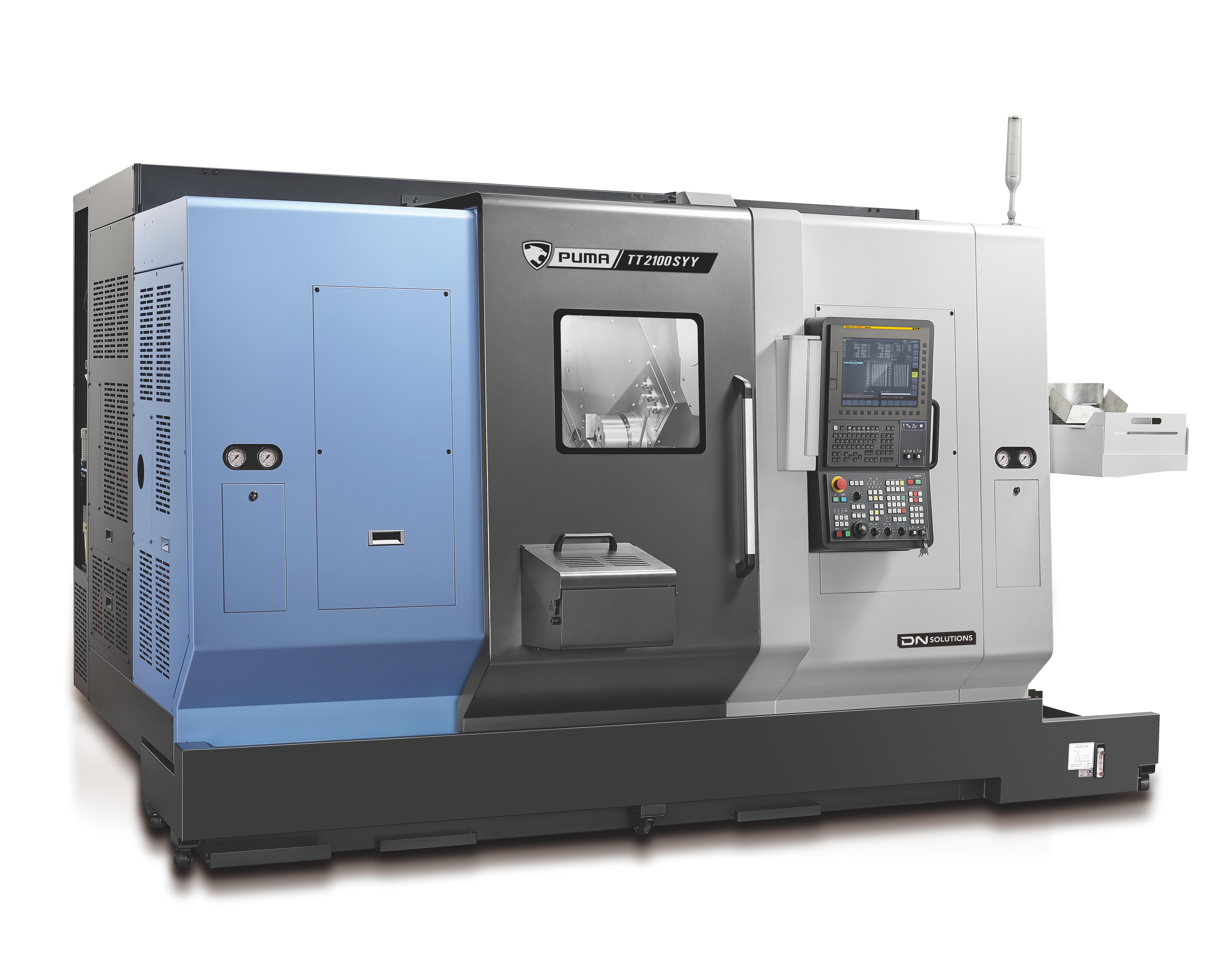 PUMA TT1300, TT1800, TT2100 ja TT2500 -sarjat ovat vaakasorvauskeskuksia, joiden tankokapasiteetti vaihtelee 42 mm:stä 81 mm:iin. Näissä koneissa on kaksi vastakkaista karaa sekä ylä- ja alarevolverit, joiden Y-akselin toiminta mahdollistaa samanaikaisen koneistuksen kahdella pinnalla. Molemmissa karoissa on yhtä suuri teho ja kapasiteetti, minkä ansiosta ne voivat toimia itsenäisesti. Maailmanlaajuisesti suosittu PUMA TT -sarja tunnetaan erinomaisesta suorituskyvystään ja luotettavuudestaan, mikä tekee siitä yhden DN Solutionsin myydyimmistä tuotesarjoista. |