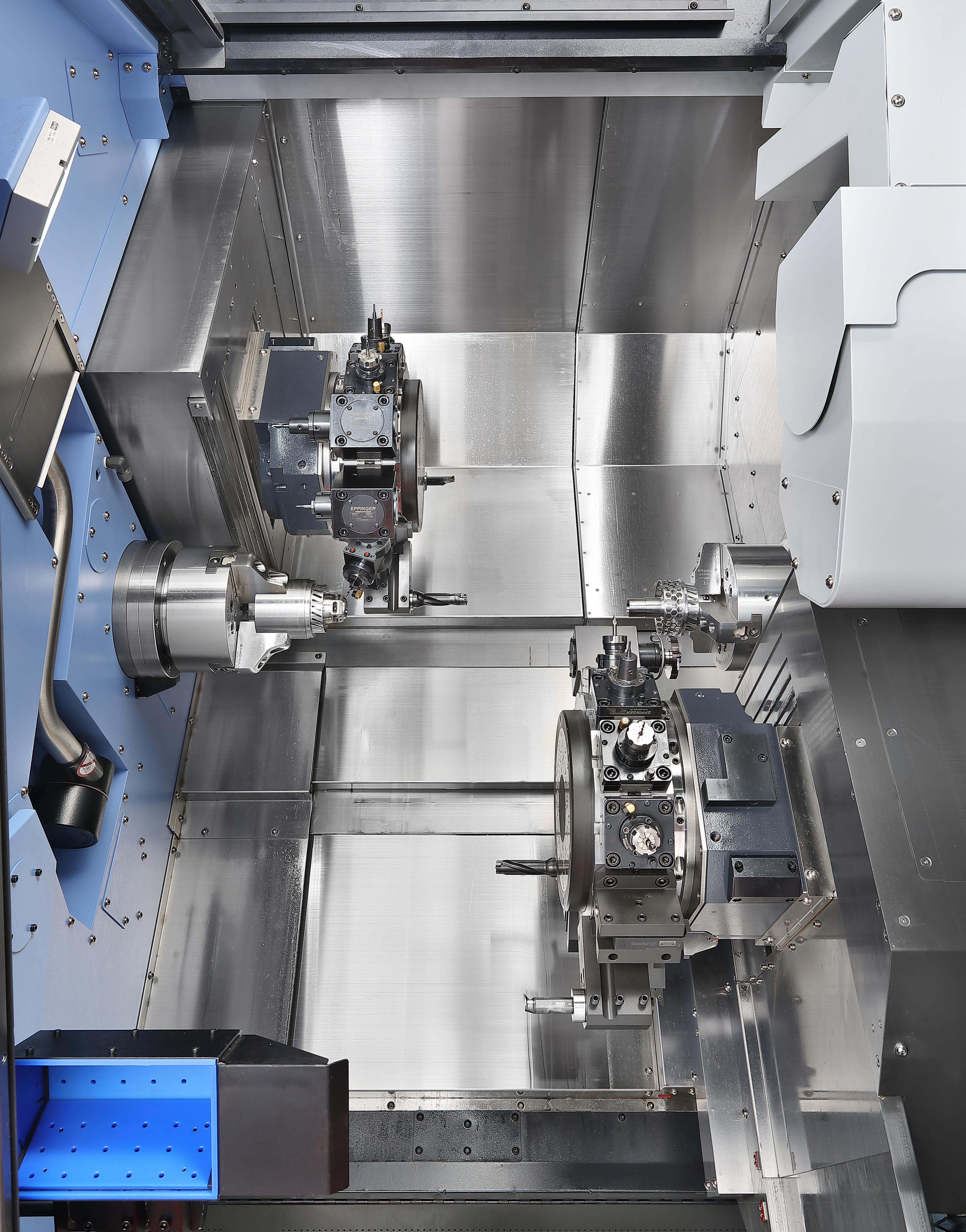 - Kahden karan tehokkuus: kaksi yhtä tehokasta karaa mahdollistavat kahden työkappaleen saman aikaisen koneistuksen.